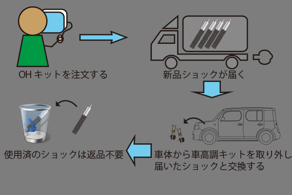 車両からサスペンションを外して分解し、発送する手間とオーバーホール期間中(2週間前後)